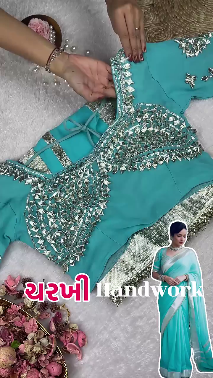 Handle with Care: Be cautious with sharp jewelry that may snag the delicate scalloped droplets or the sheer body of the saree.