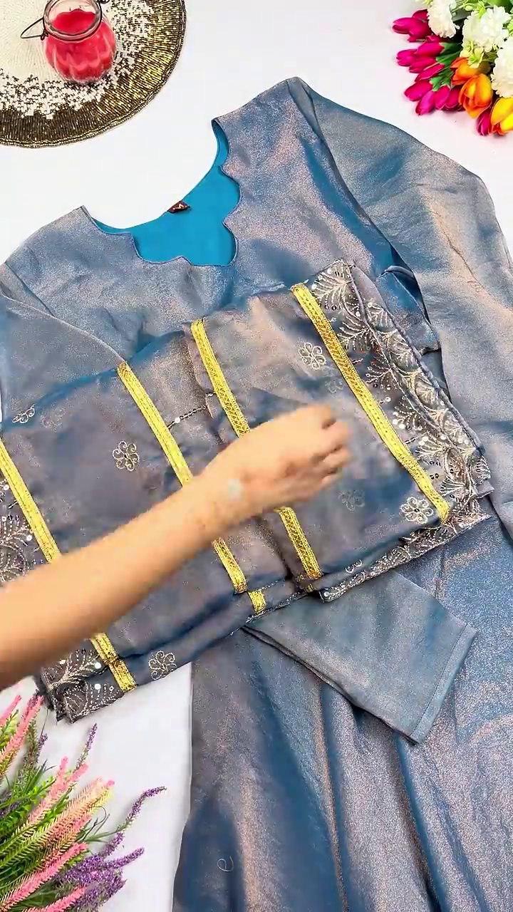 Dry clean only. To protect the delicate metallic fibers and maintain the garment’s radiant shimmer, store it in a soft, breathable muslin bag and avoid direct contact with high-heat steam irons.