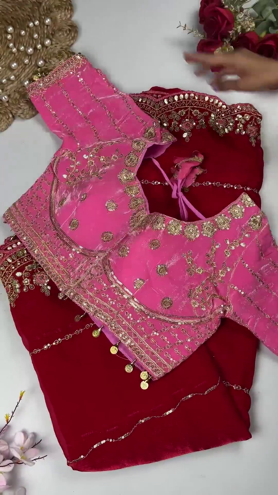 One of the standout elements of this blouse is the elegant golden coin (latkan-style) border adorning the hemline. These delicate dangling coins add movement, charm, and a festive touch, making the blouse look exceptionally rich when worn with sarees or lehengas. The neckline is softly rounded and highlighted with fine embroidery, ensuring comfort without compromising on luxury.