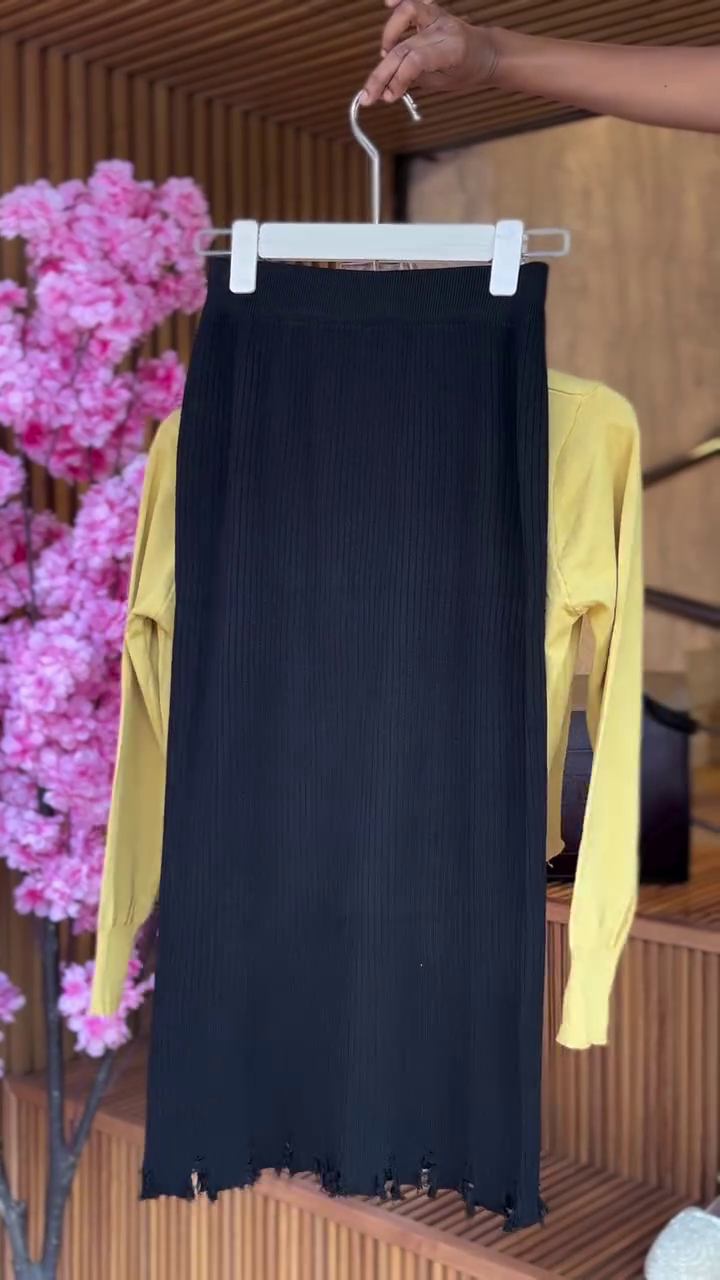 Mustard Checkered Twinset & Frayed Hem Skirt in Black